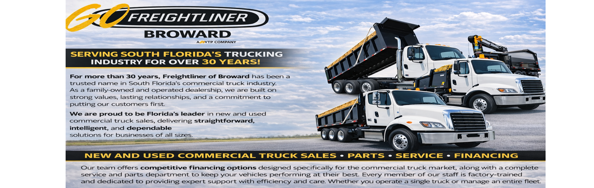 For over 30 years, Freightliner of Broward's name has been a trusted name in truck sales, service and the parts business in South Florida. Freightliner of Broward is a family owned dealership that is committed to our customers. Freightliner of Broward is South Florida's leader for new and used commercial truck sales. We offer the best financing available in the commercial truck business. We also have a complete service and parts department, and all of our staff are factory trained, specialized in getting you back on the road! If it's only one truck or an entire fleet, your business depends on having the truck operating properly. Our team of professionals can work with you in developing a truck solution that works best for you. We are your total truck parts, service and sales solution. Just contact us and we will make sure that you're completely satisfied!