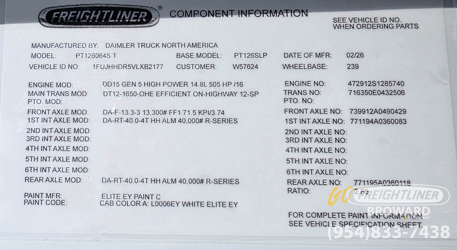 All vehicles are sold AS-IS, unless otherwise stated in writing. Any warranties provided are those of the manufacturer or third-party supplier, not Freightliner of Broward. The dealership does not assume, nor authorize any other party to assume, liability related to the sale of vehicles or associated products and services. The manufacturer or supplier is solely responsible for warranty performance.